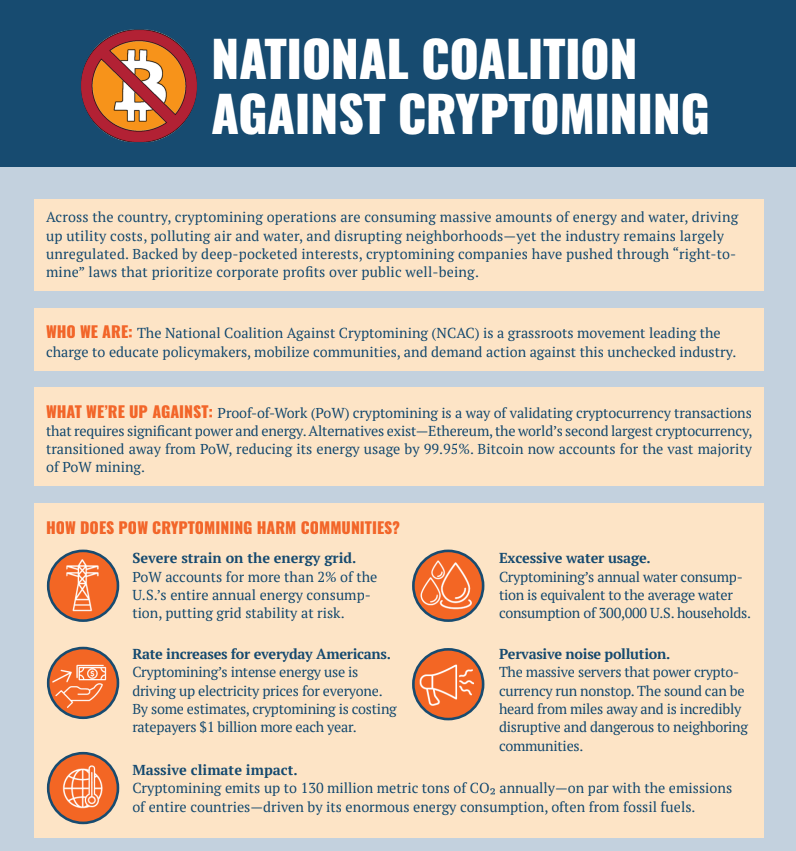 Across the country, cryptomining operations are consuming massive amounts of energy, driving up utility costs, polluting air and water, and disrupting neighborhoods – yet the industry remains largely unregulated. Backed by deep-pocketed interests, cryptomining companies have pushed through “right-to-mine” laws that prioritize corporate profits over public well-being. See more information in our FACT SHEET.